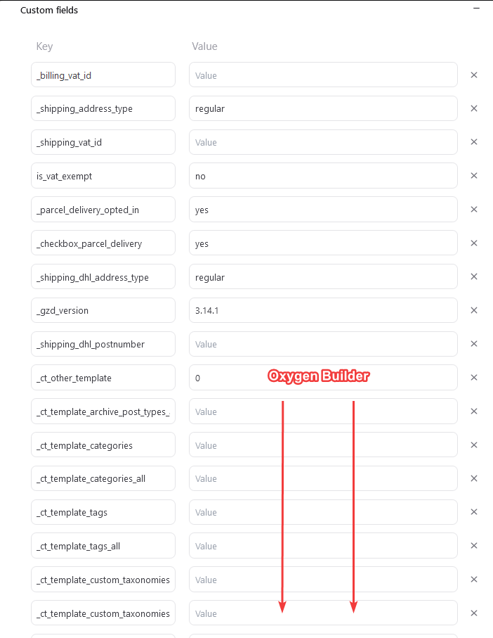 In the following example on an order there are a lot of Oxygen Builder custom fields that have no relevance. The others are Germanized custom fields and, for example, the gzd_version is not required. If possible a toggle to exclude if string starts with or contains a string and individual toggles?