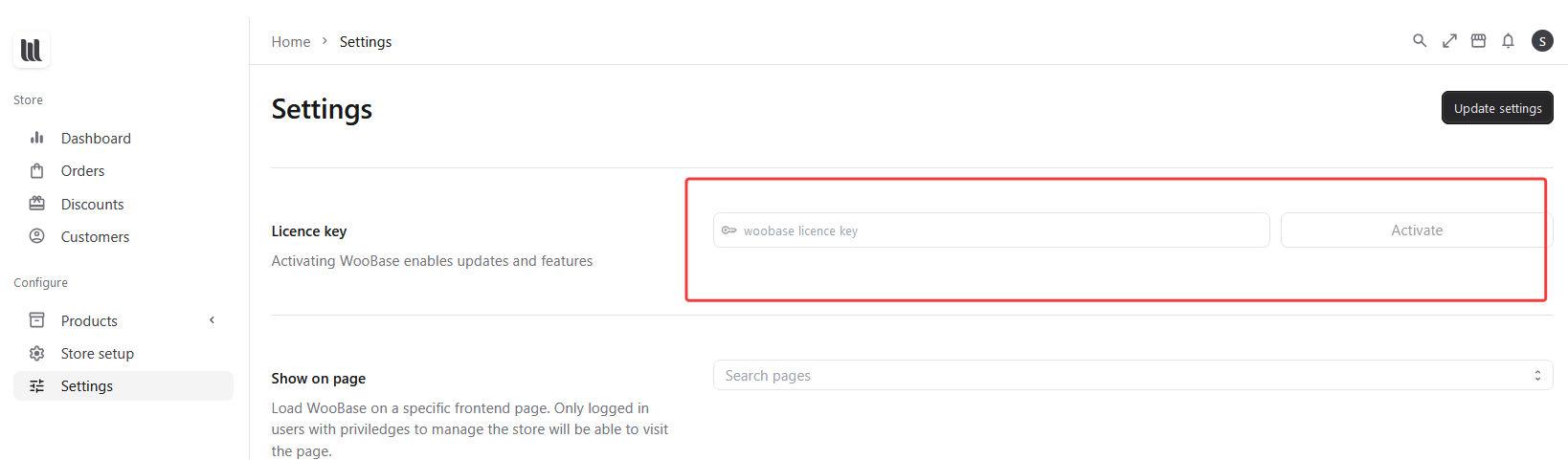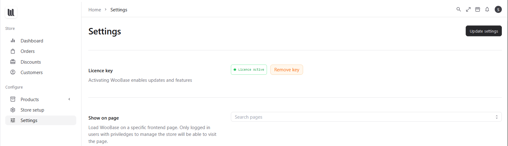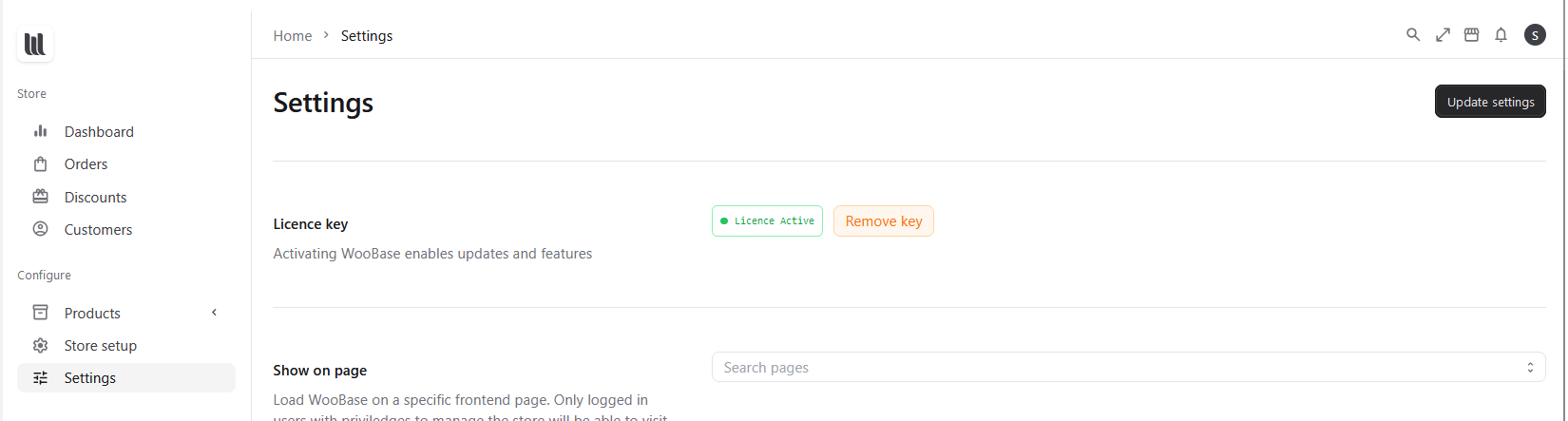 Disable Litespeed Cache plugin and navigate to Woobase the shop loads immediately and the licence is active